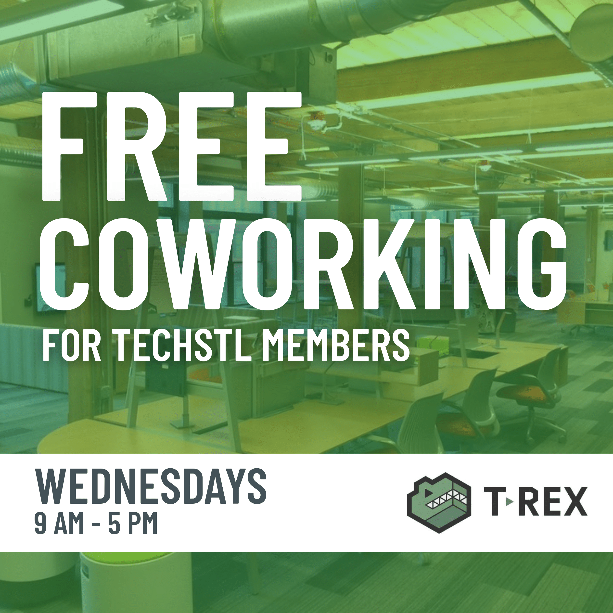 When co-working at T-REX please check-in at the 5th floor front desk and let them know you are with TechSTL. After check-in, members will have access to fifth floor shared spaces, including lounges, conference rooms, desk areas, and café. You’ll also be able to enjoy complimentary Wi-Fi and coffee stations in the Anheuser Busch Café.
